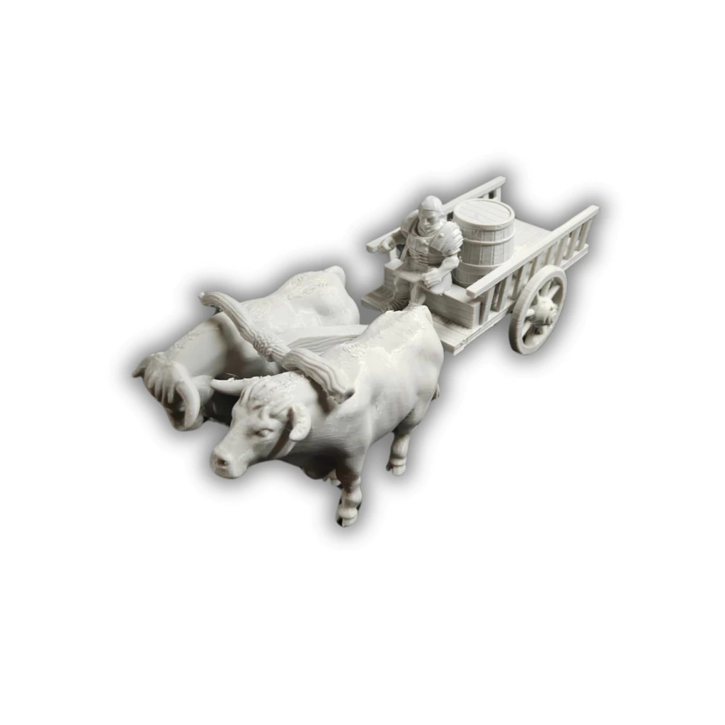 El paquete viene con la carreta, accesorios, y dos bueyes.